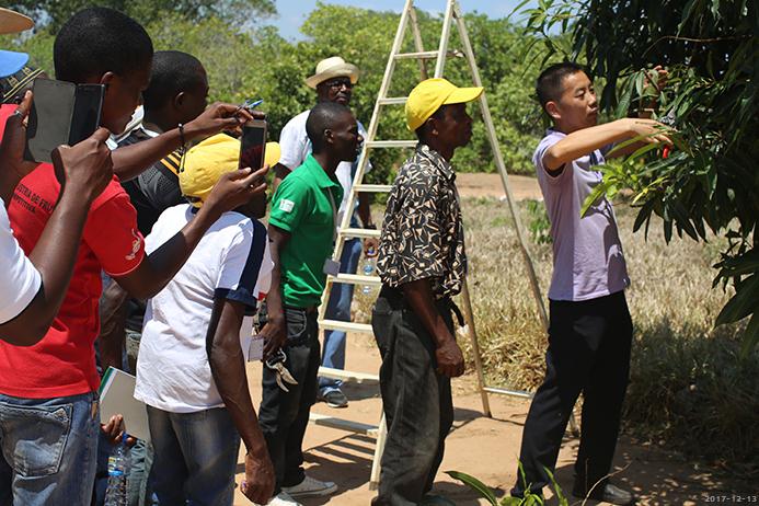为进一步巩固课堂知识,张中润和黄建峰还将学员带到了我院在莫国的芒果、腰果种植基地,通过现场演示腰果、芒果嫁接、修剪及病虫害识别和防控等技术进一步巩固培训学员对知识的理解以及上手能力。