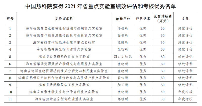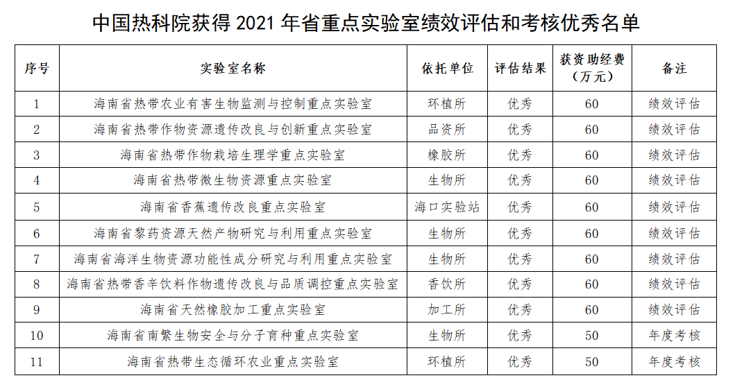 近日,海南省科学技术厅发布了2021年省重点实验室绩效评估和考核的结果,中国热科院有15个海南省重点实验室参加绩效评估,其中9个被评为优秀等次,2个参加年度考核,均获得优秀等次。