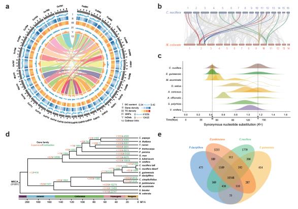 近日,中国热科院椰子研究所作为第一完成单位,联合海南大学、广西大学、华北理工大学科研团队,在国际学术期刊 Genome Biology(影响因子:13.58;中科院一区)上发表题为“High-quality reference genome sequences of two coconut cultivars provide insights into evolution of monocot chromosomes and differentiation of fiber content and plant height”的研究论文。该研究绘制了两个参考级别椰子基因组,结合变异组学、转录组学、代谢组学以及细胞学等,揭示了单子叶植物染色体的进化过程和椰子染色的形成历程;分析了高矮两种椰子耐盐性、株高、纤维和脂质含量等关键性状差异的遗传基础,同时发现在椰子进化过程中,约在400万年前自然发生的“绿色革命”。构建了高、矮种椰子基因组精细图谱,其中高种椰子基因组大小为2.39 Gb,矮种椰子基因组大小为2.40 Gb。