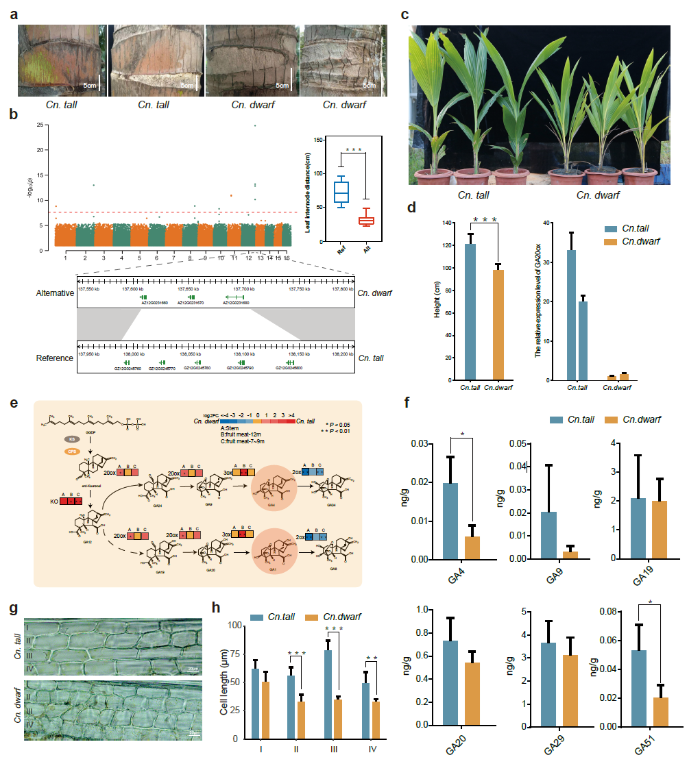 并进一步利用叶间距表型进行全基因组关联分析,鉴定出了12号染色体上GA20ox基因与椰子株高显著相关,并存在拷贝数变异(CNV);并整合多种手段验证了GA20ox以及赤霉素代谢途径在高矮种的差异导致了高矮种椰子的株高差异。该结果表明在椰子的进化过程中,大约在400百万年前自然发生了“绿色革命”。