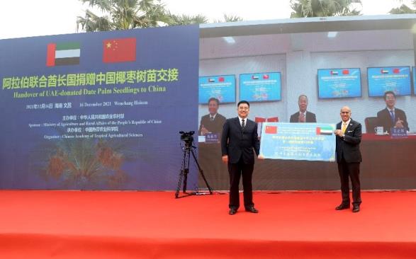 12月16日,“阿拉伯联合酋长国捐赠中国椰枣树苗交接与种植”活动在中国热科院椰子研究所隆重举行。农业农村部副部长马有祥通过视频连线致辞,交接活动由农业农村部国际合作司司长隋鹏飞主持,阿联酋驻华大使扎希里、海南省政府办公厅一级巡视员戴青云、中国热科院党组书记崔鹏伟和副院长刘国道出席活动。