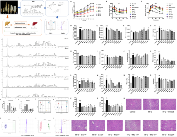 牛大力(Millettia speciosa champ.)为著名的药食同源植物,具有地方传统食用习惯,是华南地区盛行的煲汤食材,具有补脾肾、强腰膝、舒筋活络等多种功效。团队研究发现了牛大力黄酮类成分及其降脂降糖、保肝护肝的作用,并成功构建了牛大力6个栽培年限药材(1年、3年、5年、10年、15年和20年)指纹图谱,鉴定出牛大力中三萜皂苷、黄酮、酚酸等110个特征成分;发现牛大力次生代谢之间与栽培年限之间有着明显的变化规律:1年、3年和5年生的牛大力特征成分差异明显,以三萜和黄酮类物质为主,5年时达到顶点值。随着栽培年限的增加,10年、15年和20年生的牛大力特征成分比较接近,并以多糖类物质为主,黄酮类物质含量逐渐降低。采用高脂动物模型评价了牛大力提取物对肥胖引起的脂肪肝以及炎症因子的调节作用,发现牛大力可以降低肥胖相关指标,保护因为过度脂肪摄入而引起的肝炎,尤其以 5 年生和 20 年生牛大力根表现出显著的降脂效果,而 5 年生牛大力表现出更好的保肝护肝作用。综合化学物质和降脂功效评价,推测栽培5年的牛大力药效和经济价值最高,为最佳采收期。