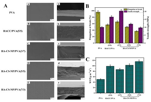 图1 壳聚糖复合涂膜微观形貌以及物理机械性能