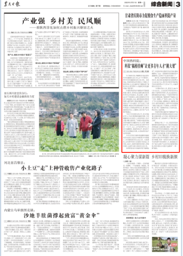 当前位置:首页»新闻中心»媒体报道 【农民日报】中国热科院:科技“揭榜挂帅”让更多青年人才“挑大梁” 来源:农民日报 作者: 记者操戈 邓卫哲 点击数:次 发布时间:2022-03-21 我要分享 打印 【字体: 大 中 小 】 报道链接:https://szb.farmer.com.cn/2022/20220321/20220321_003/20220321_003_7.htm