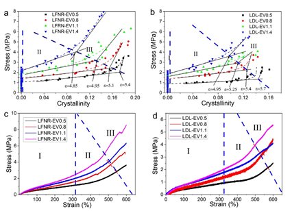 不同交联密度天然橡胶的应变诱导结晶对应力的影响