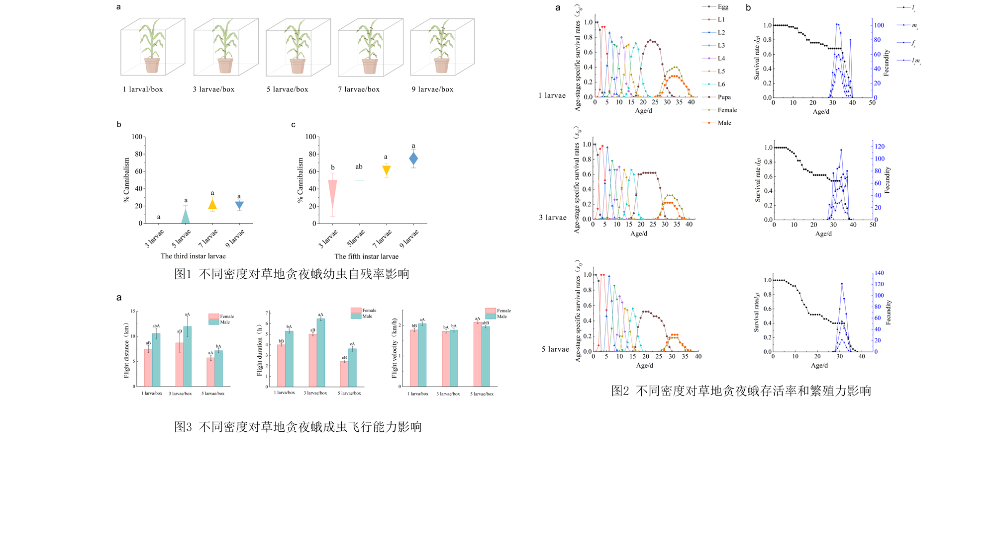团队研究发现,草地贪夜蛾幼虫在食物匮乏和高密度竞争条件下会表现出更强的自相残杀行为,这一行为虽能在短期内帮助幼虫获得额外营养并加速发育,但会削弱成虫的繁殖能力和长距离飞行能力。然而,成虫的迁飞意愿却显著增强,表现出更强的起飞倾向和逃逸行为,提示食物资源压力可能是驱动草地贪夜蛾迁飞扩散的重要生态因子。