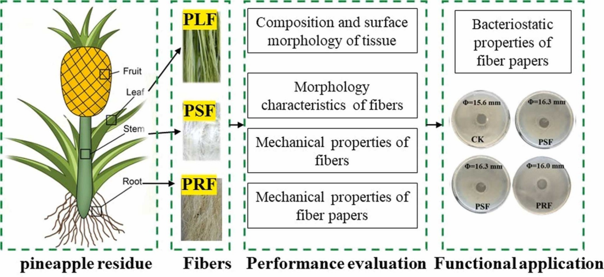 该研究成果以“From agricultural waste to functional materials: A comparative study on pineapple fibers for antibacterial paper applications”为题发表于《Industrial Crops & Products》,中国热科院加工所刘义军副研究员和马会芳助理研究员为共同第一作者,张少凯博士、广东医科大学时明阳博士、华南理工大学陈港教授为共同通讯作者。该研究得到了中国热带农业科学院国家热带农业科学中心科技创新团队等项目的资助。