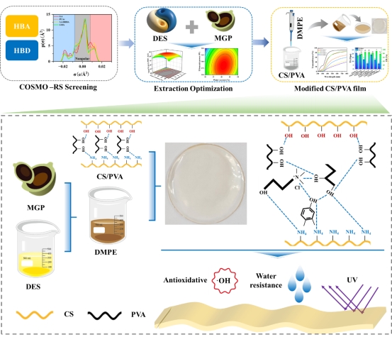 研究团队针对澳洲坚果青皮利用率低、传统提取方法效率不高等突出问题,采用COSMO-RS模型从696种低共熔溶剂组合中筛选出最佳提取体系——氯化胆碱与1,2-丁二醇(摩尔比1:1)。通过超声辅助提取结合响应面优化法,多酚提取率高达91.09 mg没食子酸当量/g干基,约是传统乙醇提取法的3倍。此外,研究团队将澳洲坚果青皮多酚低共熔溶剂提取液直接应用于壳聚糖/聚乙烯醇保鲜膜的制备,成功开发出兼具抗氧化与紫外线阻隔功能的新型包装材料,显著提升了薄膜的延展性和热稳定性。该研究不仅实现了农业副产物的资源化利用,还推动了绿色提取技术与活性包装材料的融合,为可持续发展与食品保鲜领域提供了可行的技术路径。
