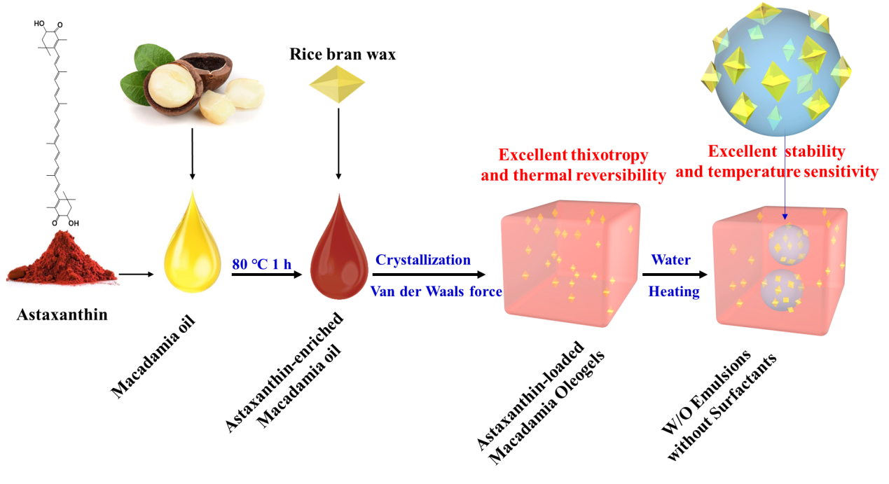 近日,中国热科院南亚所热带特色资源加工与高值化利用团队揭示了不同组分配比对澳洲坚果油凝胶网络强度及乳液热响应性能的影响机制,首次系统评估了该体系在虾青素递送与体外释放中的表现,为新型固体脂肪、无表面活性剂乳剂以及调节脂质消化和控制营养物质释放的功能食品的开发提供指导。