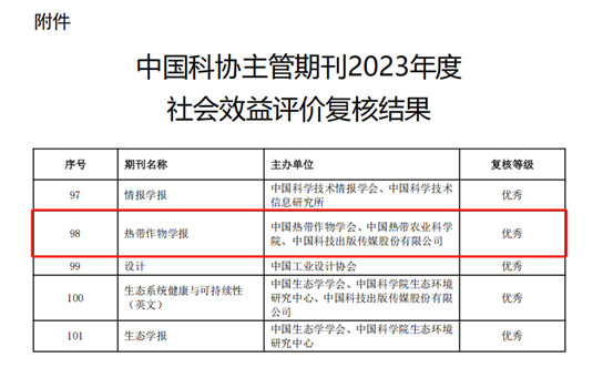 12月24日,中国科协发布《关于中国科协主管期刊2023年度社会效益评价复核结果的通报》(科协创函刊字〔2024〕69号),中国热带作物学会、中国热带农业科学院、科学出版社共同主办的《热带作物学报》在此次社会效益评价考核工作中,获得“优秀”等级。