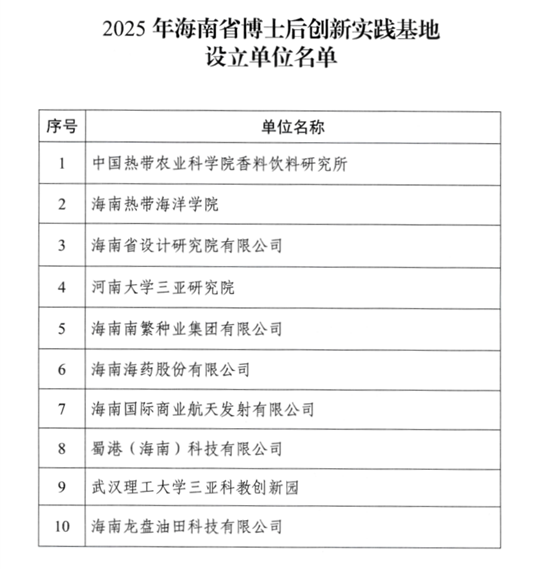 近日,中共海南省委人才发展局完成2025年博士后创新实践基地遴选工作,全省共有10家单位批准设立博士后创新实践基地,香饮所入选。