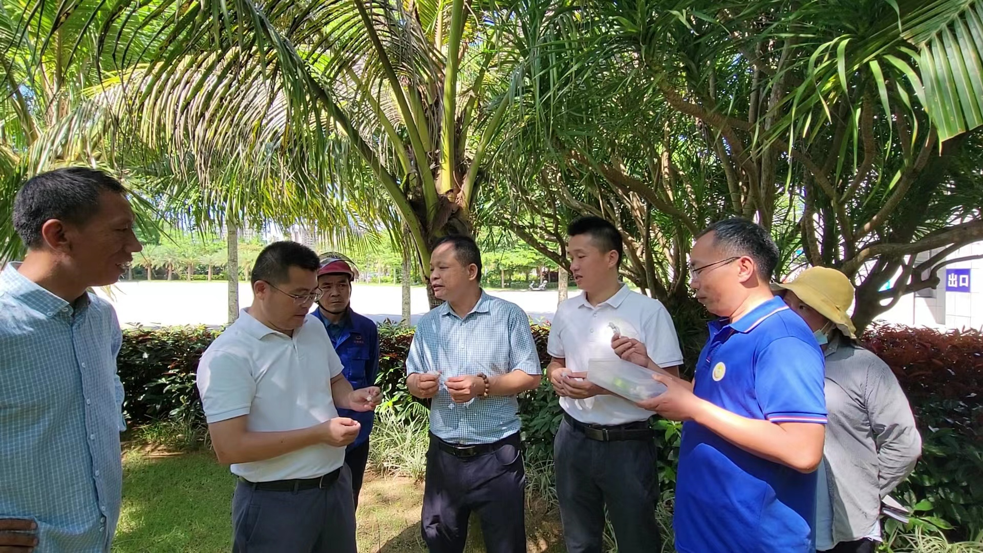 6月6日上午,应后勤服务中心邀请,椰子所覃伟权研究员、李朝绪副研究员一行到海口院区开展棕榈植物病虫害调查及椰子椰心叶甲生物防治技术指导。后勤服务中心主任陈志权、副主任余树华等相关人员到现场参加防治技术学习。