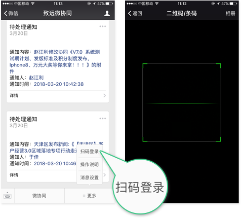 微信扫码使用手机微信端安全登录V5协同安全管理平台。使用它需要关注致远微协同公共账号, 致远微协同是致远推出的与V5协同安全管理平台共同服务用户的产品, 它提供了致远V5协同办公产品与微信"服务号"、"企业号"的无缝集成,为您的企业移动办公带来快捷、高效、安全、统一的入口。