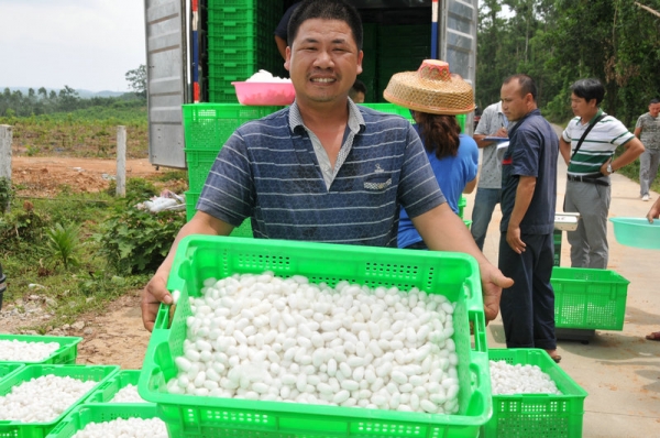2016年8月29日,试验场“热带高效种桑养蚕技术集成与示范”项目取得阶段性成果,第一批饲养蚕产茧总量达377.9千克,平均每张蚕产量48.4千克,高于海南种桑养蚕的平均水平。上谷茧丝绸公司负责人如约来到养蚕基地,对该批蚕茧给予高度评价,并按照36元/千克以上的价格收购所有蚕茧。