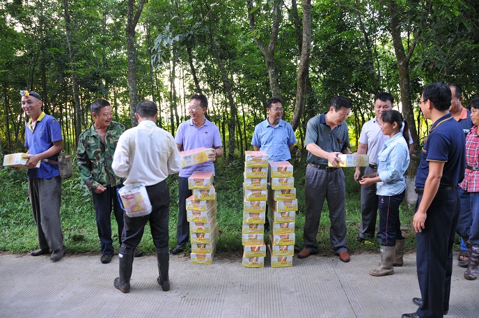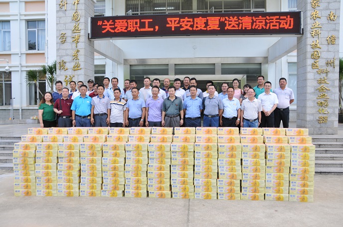 7月10日,群工部支部与院机关第五支部开展“关爱职工,平安度夏”送清凉活动,为我场护林和割胶工人送上清凉解暑饮料共计400箱。