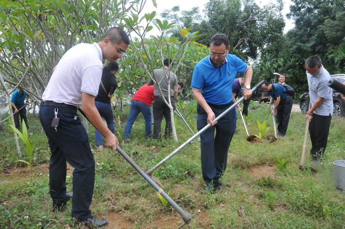 随后,大家纷纷拿起锄头、小水桶等工具,在七队的道路旁给槟榔苗施肥。在领导们的率先垂范下,党员们热情高涨。有的用锄头开沟,有的用小水桶装肥料下肥,还有的填土和锄草。之后大家还将环植所赠送七队的200株槟榔苗种植在道路旁。大家都是以一名党员的身份参与其中,分工明确、配合默契。整个劳作现场热火朝天,充满欢声笑语。