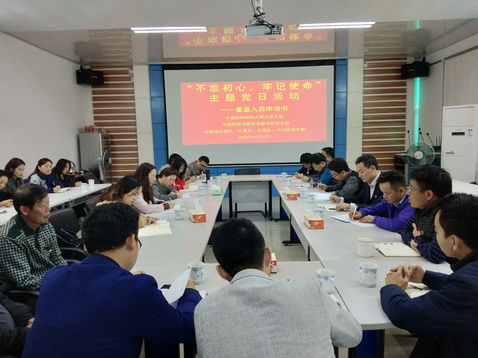 12月12日,院机关第五党支部和热作学会秘书处党支部联合到我场开展“不忘初心,牢记使命”主题党日活动,重温入党申请书和入党誓词,并参观有关重点项目基地,了解热带农业科技博览园建设情况。场长徐志、副场长温春生,以及红城队、红星队、马宿队、大白队等党支部支委参加以上活动。