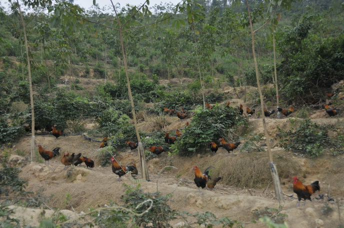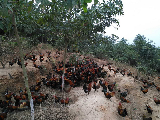 中国热带农业科学院试验场红旗队种植牛大力150多亩,在地里放养山鸡,年出栏牛大力山鸡10000多只。山鸡在牛大力地里活动觅食,主要吃食牛大力叶子、虫子、野草等天然食物及少量的谷物苞米等,散养的山鸡,食之色味俱佳。红旗队牛大力山鸡绿色无公害,味道独特,鸡肉细嫩多汁,低脂肪,胆固醇含量低,营养丰富,是美味佳肴所需的上乘首选主料。